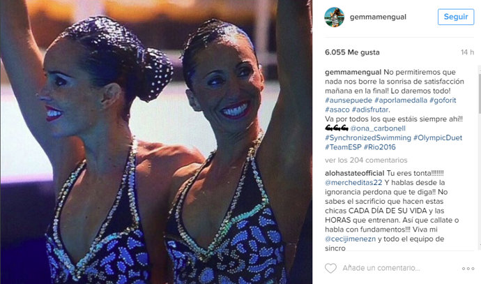 Ya fuera de la piscina Gemma Mengual parece haberse olvidado de la decepción del quinto puesto y ha sacado fuerzas y ánimo para disputar la final de esta tarde. Así lo ha compartido en sus redes sociales: "No permitiremos que nada nos borre la sonrisa de satisfacción mañana en la final! Lo daremos todo! #aunsepuede #aporlamedalla #goforit #asaco #adisfrutar. Va por todos los que estáis siempre ahí!! @ona_carbonell #SynchronizedSwimming #OlympicDuet #TeamESP #Rio2016".