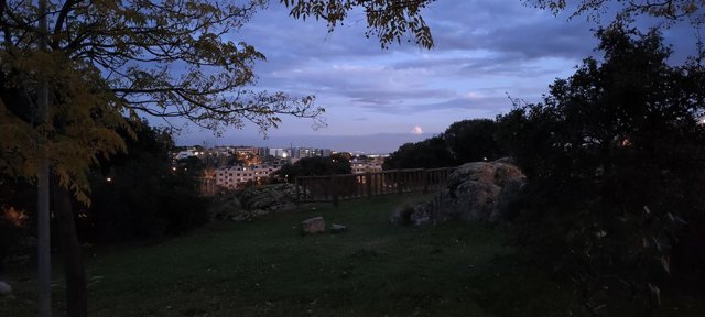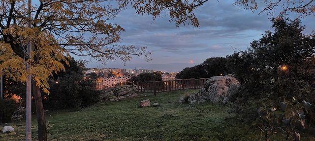 Con el modo foto en la fotografía del parque al atardecer, que tiene más luz, es difícil ver el césped, la farola, los árboles y las rocas que se encuentran más cerca, pero al emplear el modo noche, podemos observar todos estos elementos perfectamente.