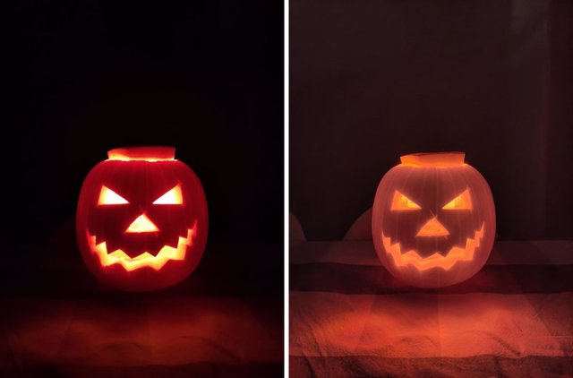 En cuanto a la fotografía de la calabaza, al hacerla con el modo foto logramos una imagen en la que tan solo se puede observar la luz que produce la vela, quedando el resto de la fotografía en negro, mientras con el modo noche es posible ver la calabaza por completo, así como la mesa en la que está apoyada e incluso la silla que se encuentra detrás.