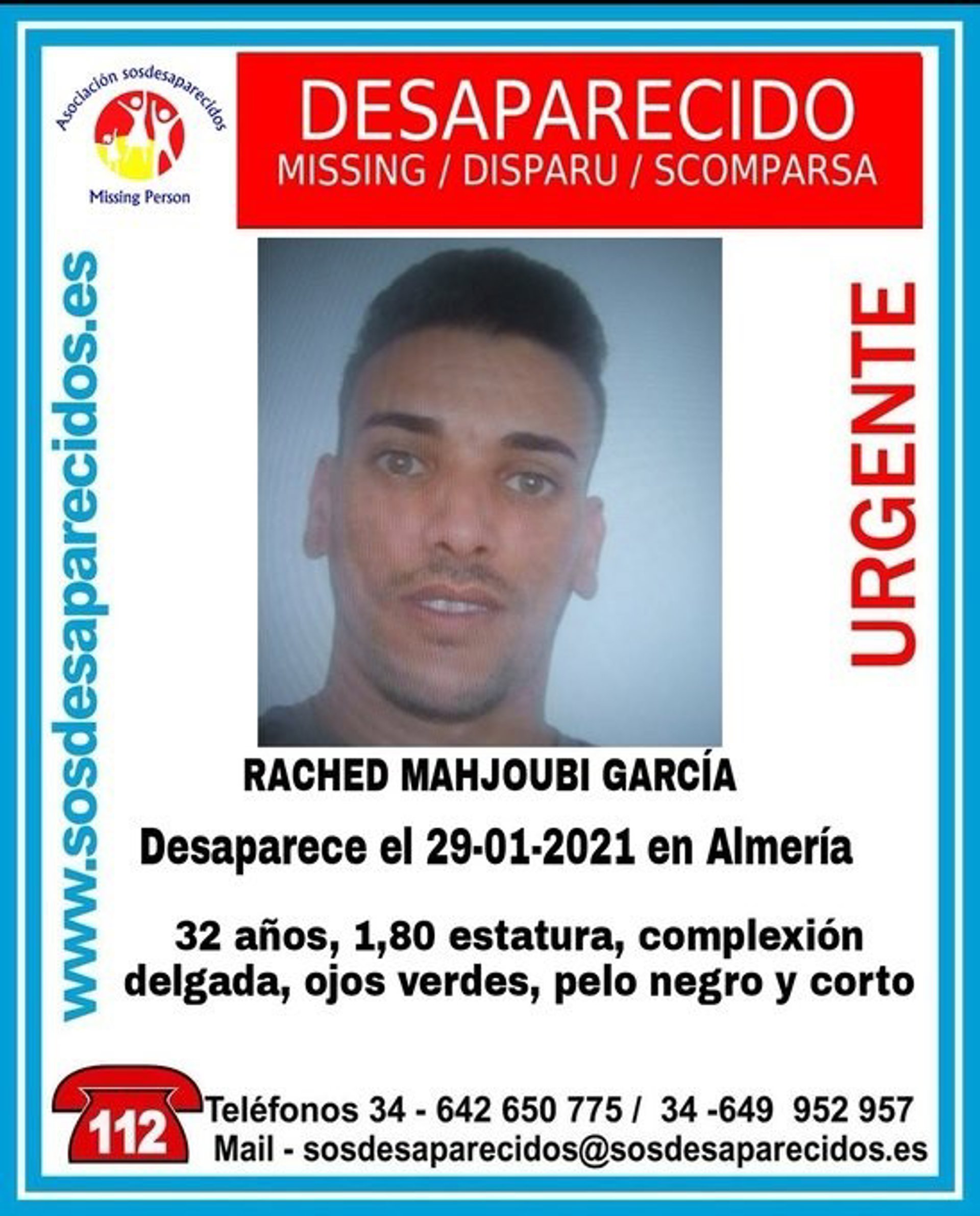 La asociación SOS Desaparecidos ha alertado este lunes de la desaparición de Rached Mahjoubi García, un hombre de 32 años al que se le perdió la pista el pasado viernes 29 de enero en Almería capital.