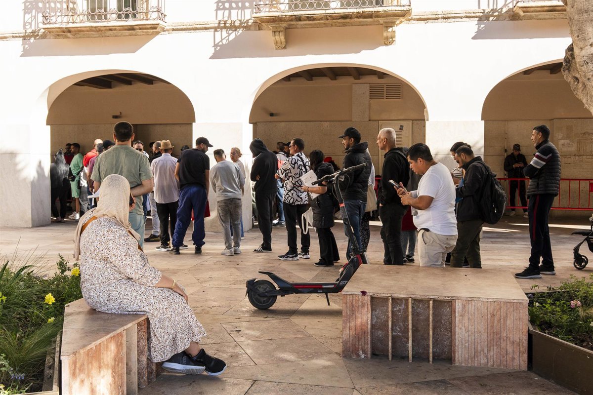 Personas migrantes hacen cola para la tramitación de su regularización administrativa frente al Ayuntamiento de Almería. - Marian León - Europa Press