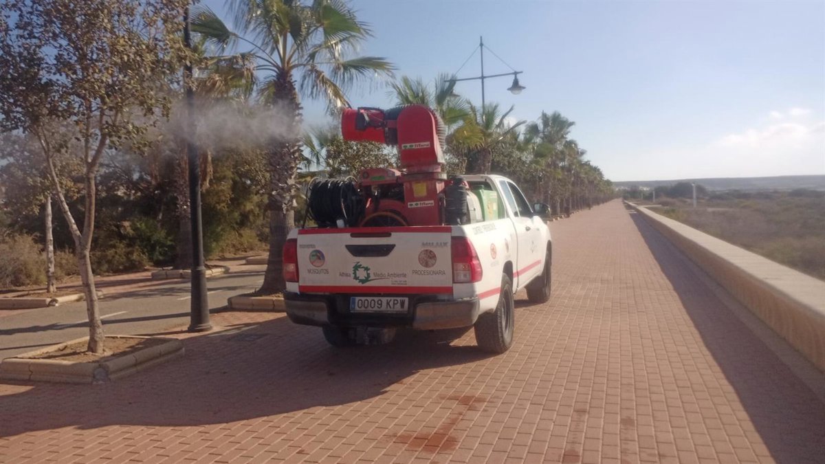 Un vehículo actúa contra los mosquitos en la costa de El Ejido (Almería). - AYUNTAMIENTO DE EL EJIDO