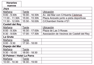 La empresa ha indicado que se ampliarán puntos de recogida, lo que conlleva "un cierto cambio" de horarios en todas las zonas afectadas. De este modo, se pasa de una a tres ubicaciones para la recogida de agua en Joya, al igual que hace unos días se pasó de uno a dos en Castell del Rey para adaptar las franjas a las necesidades del reparto.