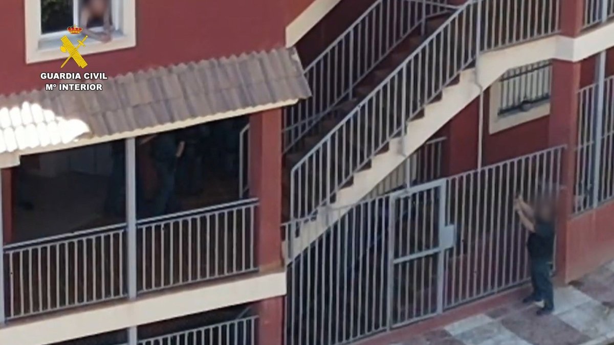 Un agente de la Guardia Civil apunta al hombre que efectuó varios disparos por su ventana en Aguadulce, en Roquetas de Mar (Almería). - GUARDIA CIVIL