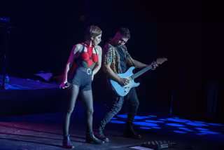 Belén Alarcón junto a un guitarrista de su banda en el concierto de homenaje a Mecano celebrado en el Maestro Padilla. - AYTO. DE ALMERÍA