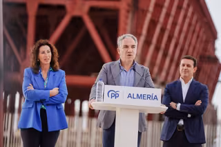 El coordinador general del PP nacional, Elías Bendodo (c) junto a la alcaldesa de Almería, María del Mar Vázquez (i) y el presidente del PP de Almería y la Diputación, Javier Aureliano García (d) frente al Cable Inglés de Almería. - PP