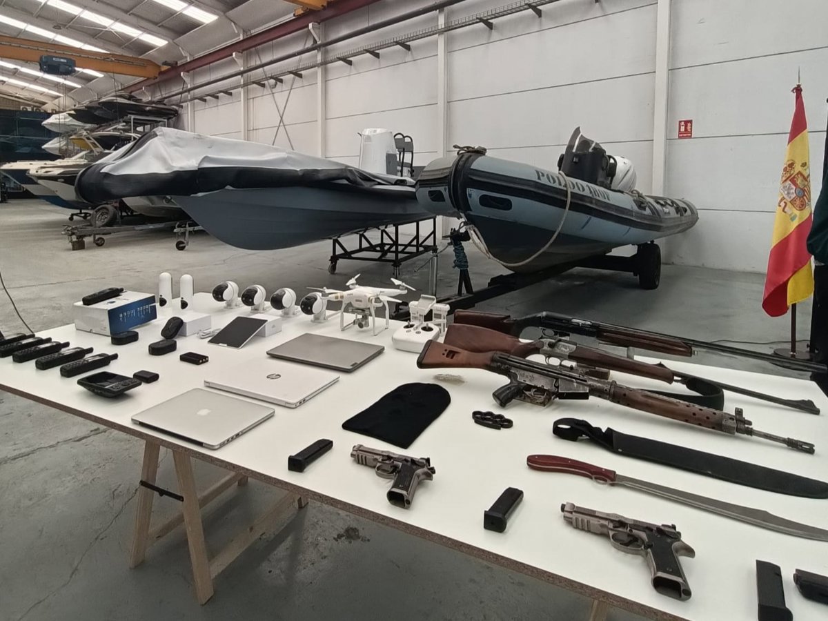 Los agentes han intervenido en el transcurso de sus operativos dos 'narcolanchas' --alguna de ellas valorada en hasta 180.000 euros--, dos gomas con motor 225 y 150 caballos, 1.175 litros de combustible en 65 petacas para el abastecimiento y cuatro armas de aire comprimido además de dos escopetas del calibre 12, dos armas blancas prohibidas y un dron.
