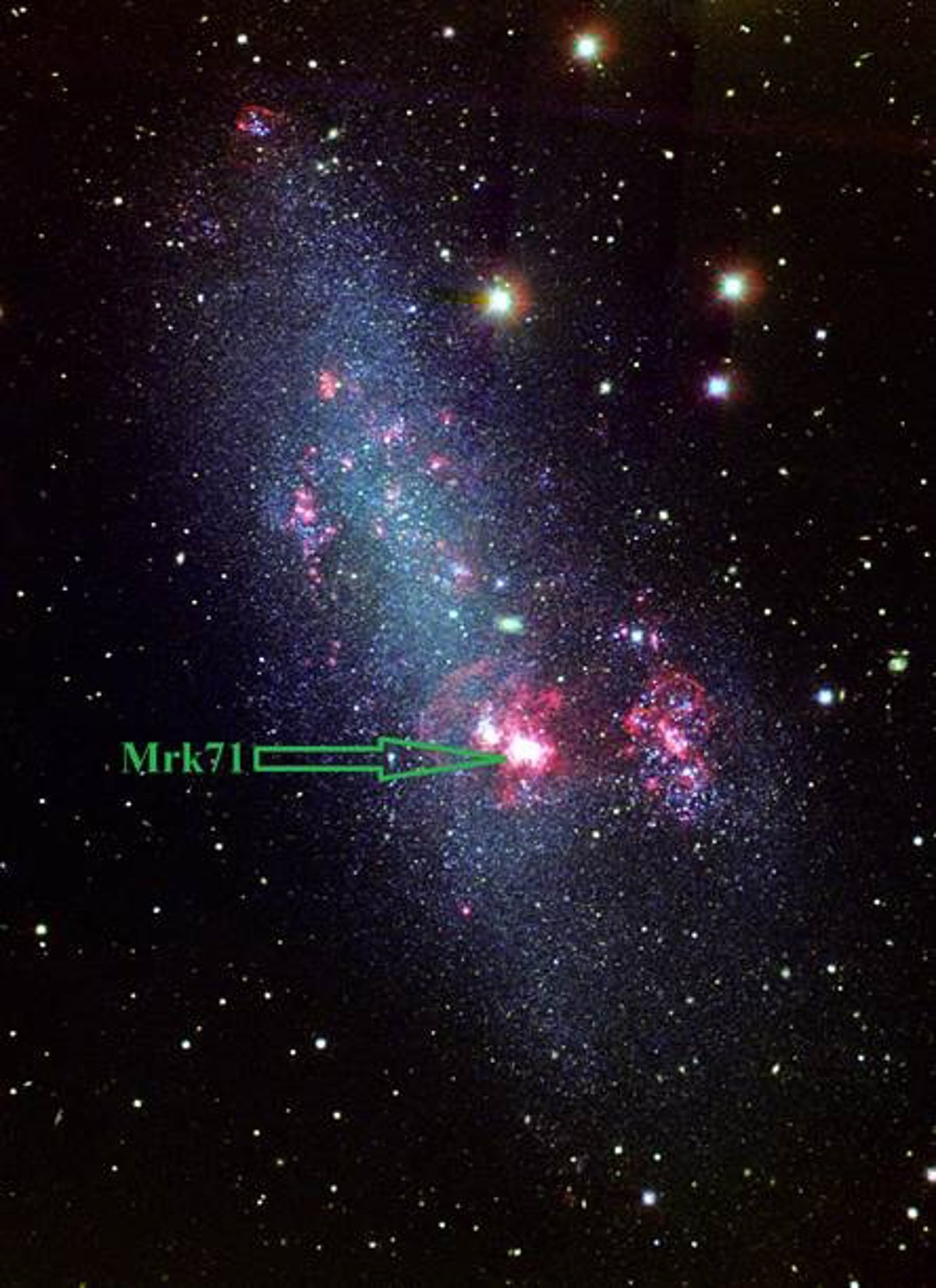 En la región sur de NGC 2366 se encuentra Mrk 71, una nebulosa gigante y dos cúmulos de estrellas jóvenes y calientes que iluminan el gas (principalmente hidrógeno) que los rodea. Estos grandes complejos nebulares son lugares donde se están formando estrellas masivas.
