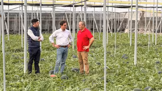 El alcalde de El Ejido, Francisco Góngora, y el concejal de Agricultura, Manuel Martínez, han visitado el invernadero de José Antonio Herrera, uno de los muchos agricultores del municipio que se preparan para cortar sandía en los próximos días. En la visita también han estado acompañados de Paco Peralta, experto en el corte de sandías, profesión a la que ha dedicado más de 40 años.