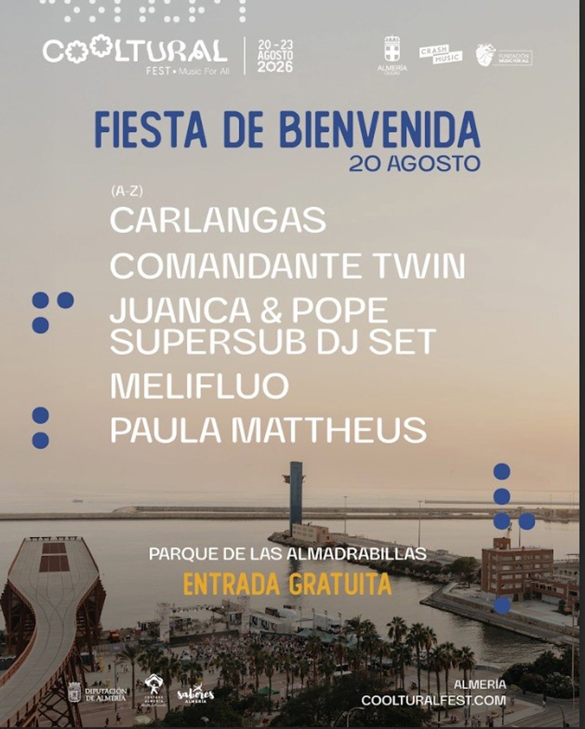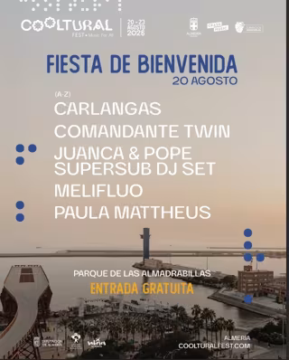 El festival almeriense Cooltural Fest 2026 ha desvelado el cartel de artistas que protagonizarán su tradicional fiesta de bienvenida, que se celebrará el jueves 20 de agosto en el Parque de las Almadrabillas, con entrada gratuita y la participación de Carlangas, Comandante Twin, Juanca & Pope Supersub Dj Set, Melifluo y Paula Mattheus.