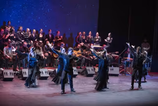 Con una puesta en escena sobria y elegante, con un telón de cielo estrellado como fondo y una 'candela' en el cuerpo central de los tres grupos de baile repartidos detrás de la primera línea de cantaores, palmeros y músicos, el Auditorio Municipal Maestro Padilla de Almería recibió en la noche de este viernes el abrazo y el calor de 'Chanqueños pa' Belén en familia'.