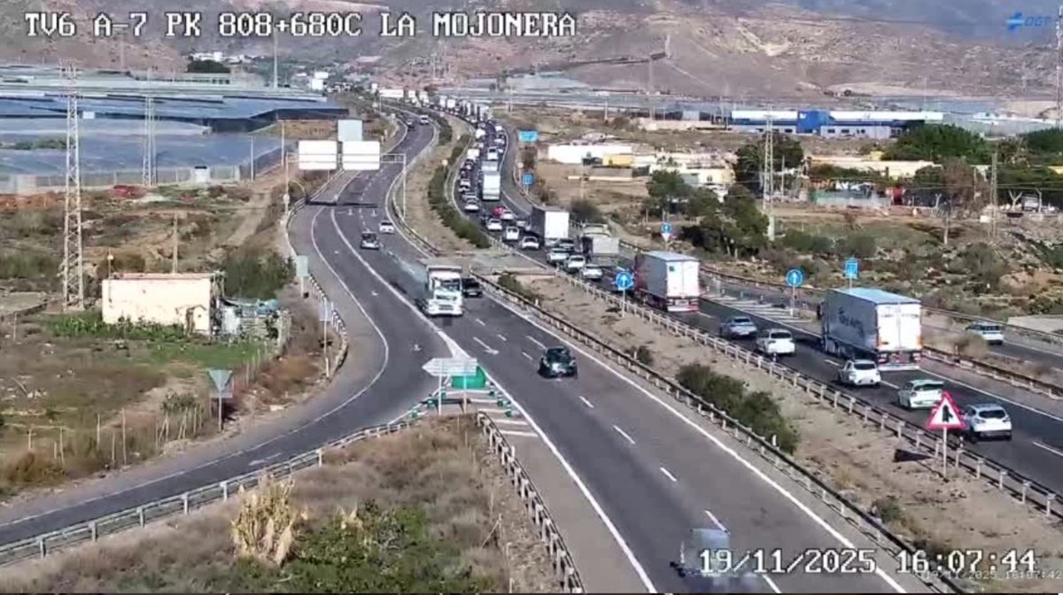 La colisión en cadena sin heridos de tres vehículos en la autovía A-7 a su paso por Vícar (Almería) ha provocado retenciones en el tráfico de más de dos kilómetros en uno de los lados del a vía, sentido Murcia