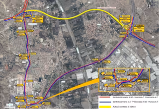 El Ministerio de Transportes y Movilidad Sostenible ejecuta las obras de remodelación del enlace entre la A-7 y la A-92 en Viator (Almería), lo que obligará a cortar la A-7 en ambos sentidos entre los kilómetros 775,6 y 781,75 desde el viernes 7 de febrero a las 16,00 horas hasta las 24,00 horas del domingo 9 de febrero.