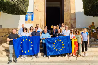 La eurodiputada Carmen Crespo y otros cargos de su partido llegan a la iglesia de Dalías (Almería) para entregar una bandera de la Unión Europea. - PP