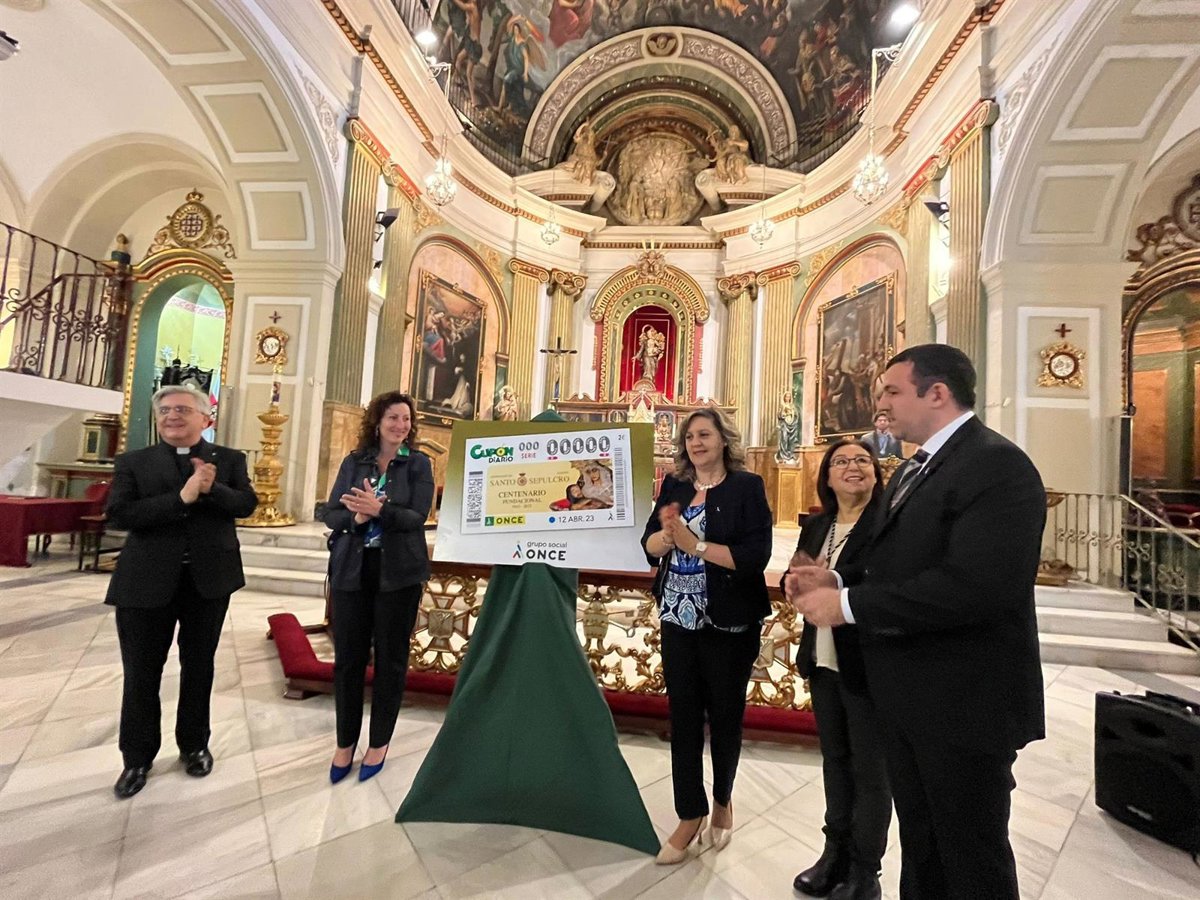La ONCE ha presentado este miércoles la imagen con la que va a dedicar el sorteo del miércoles 12 de abril al Centenario de la Hermandad del Santo Sepulcro de Almería en un acto que se ha celebrado en la Parroquia de San Pedro de la capital.
