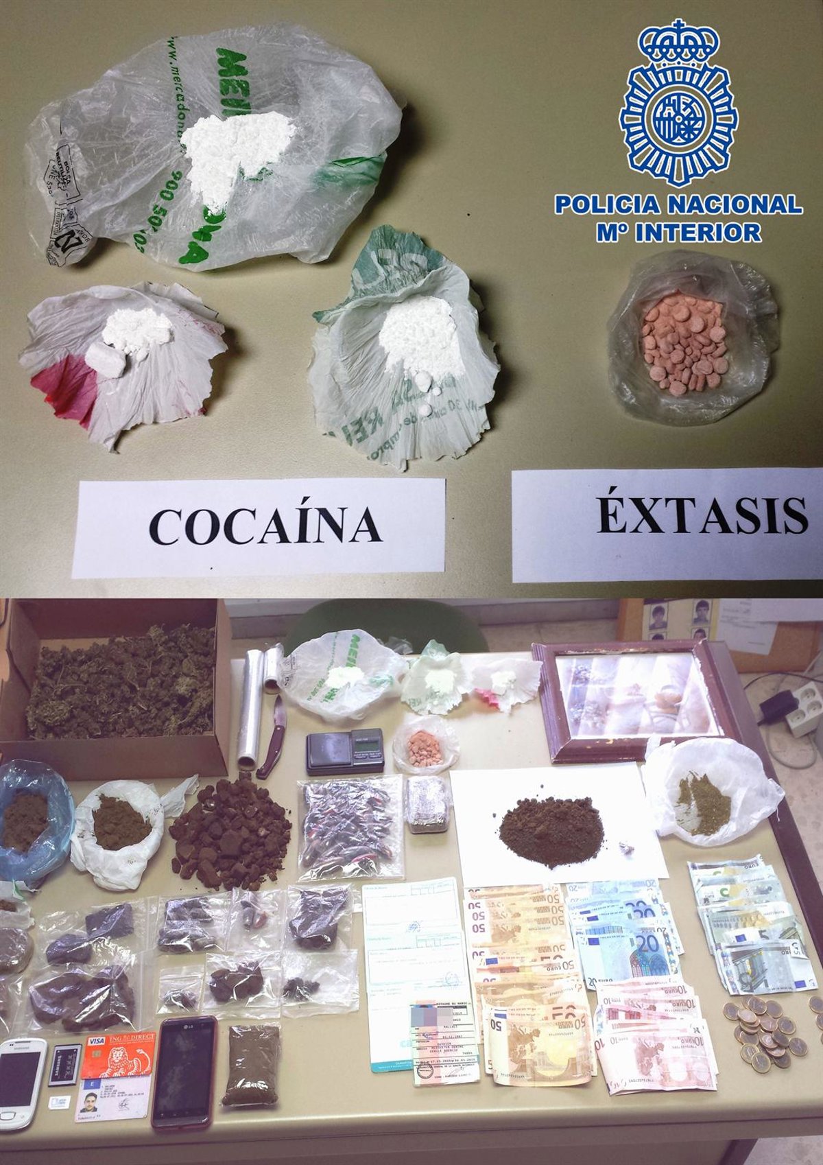 El operativo policial culminó el pasado día 6 con su detención y registro simultaneo de sus viviendas. Los agentes se incautaron de 30 gramos de cocaína, 25 gramos de éxtasis, 1.100 gramos de hachís repartidos en 35 bellotas y en varias placas, 550 gramos de marihuana en cogollos, y 1.200 euros en efectivo.