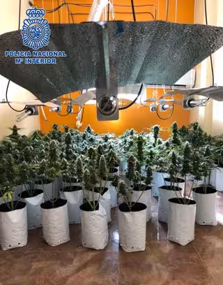 La Policía Nacional ha detenido a un hombre de 43 años identificado como L.F.V. acusado de un delito contra la salud pública tras hallarse en posesión de 220 plantas de marihuana que arrojaron un peso total de ocho kilos, así como de 25 transformadores, 20 lámparas halógenas, 27 bombillas de 600 vatios, dos extractores de aire, un ventilador y una máquina de aire acondicionado industrial para fomentar el cultivo en una vivienda del barrio almeriense de Los Almendros.
