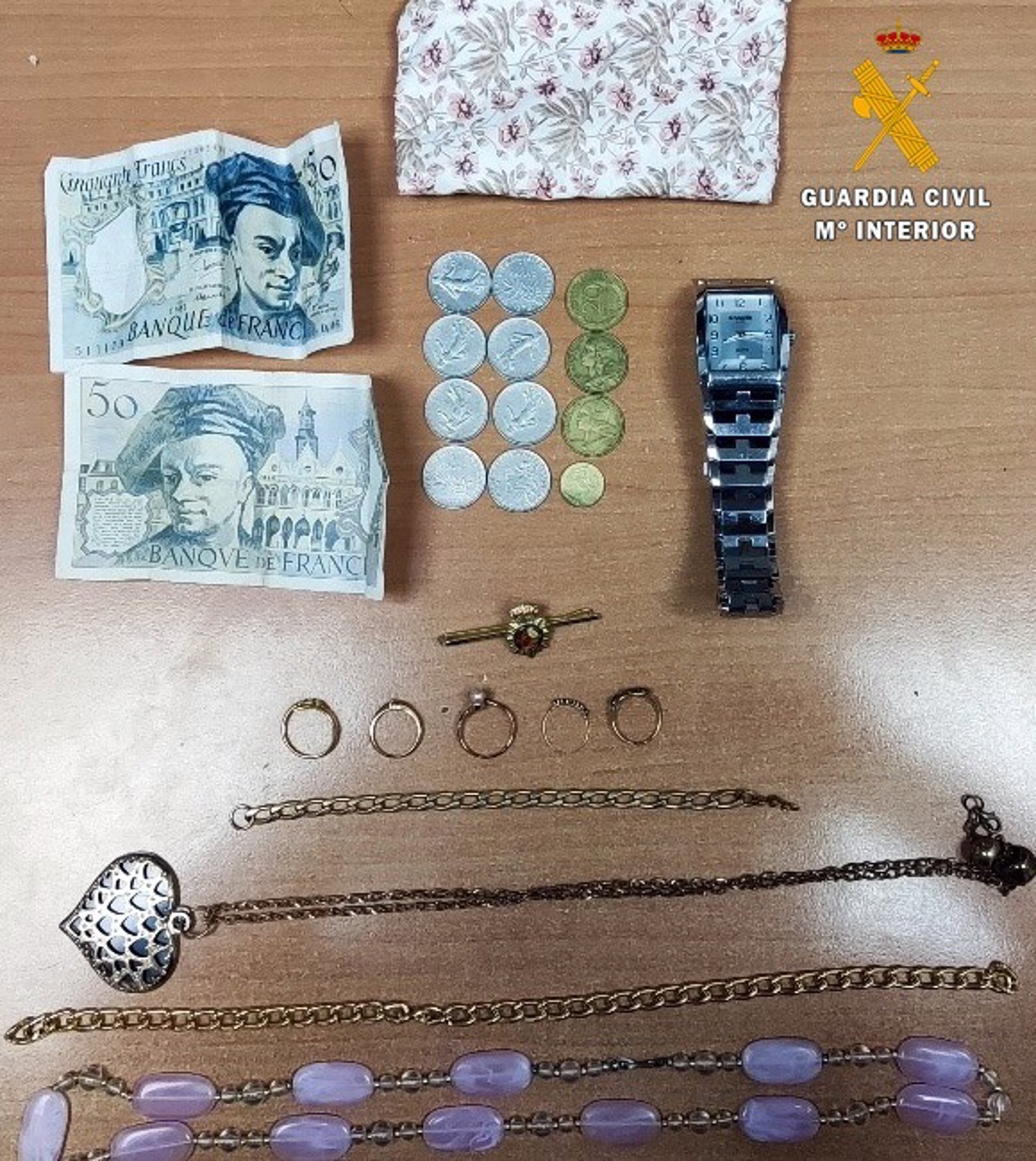 A su llegada, los agentes inspeccionaron la vivienda y localizaron al sospechoso, al que se intervino un bolso lleno de joyas y bisutería, dinero en efectivo y varios anillos ocultos en los calcetines.