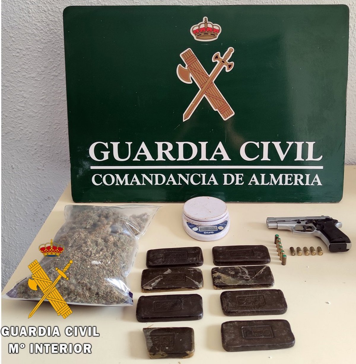 La Guardia Civil ha detenido en el núcleo poblacional de Almerimar, en El Ejido (Almería), a J.M.S. como presunto autor de un delito de tráfico de drogas y otro de tenencia ilícita de armas y municiones, tras un desahucio en una vivienda en la se encuentran cogollos de marihuana y un intento frustrado de entrar nuevamente por parte del supuesto autor de los hechos y durante el que se le interviene hachís y una pistola de fogeo.