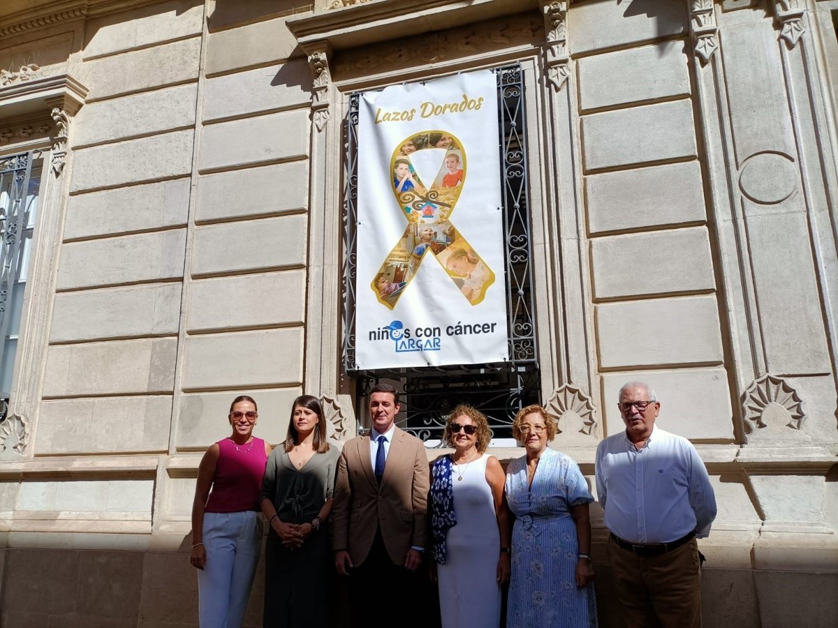 El presidente de la Diputación de Almería, Javier Aureliano García, y la presidenta de la asociación de niños con cáncer de Almería (Argar), Rosa María Onieva, han descubierto este jueves el lazo dorado que se ha colocado en la fachada del Palacio Provincial y que permanecerá hasta finales de este mes para concienciar sobre esta enfermedad y visibilizar a los menores que la padecen.