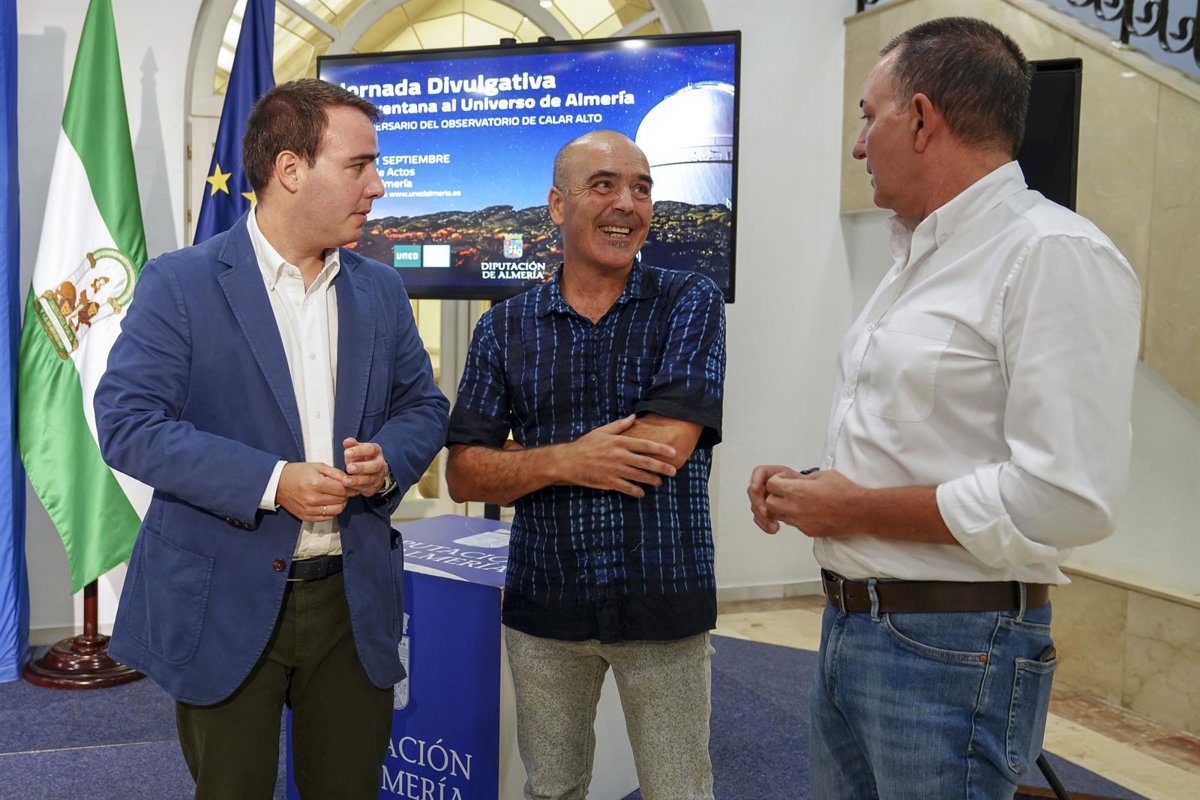 El vicepresidente, Fernando Giménez, el director de la UNED, José Jesús Gázquez, y el jefe del grupo de Astronomía del Observatorio Astronómico de Calar Alto, Jorge Iglesias, han desvelado los detalles de una cita que se celebra los días 20 y 21 de septiembre, bajo el título 0Calar Alto: Una ventana al Universo de Almería'.