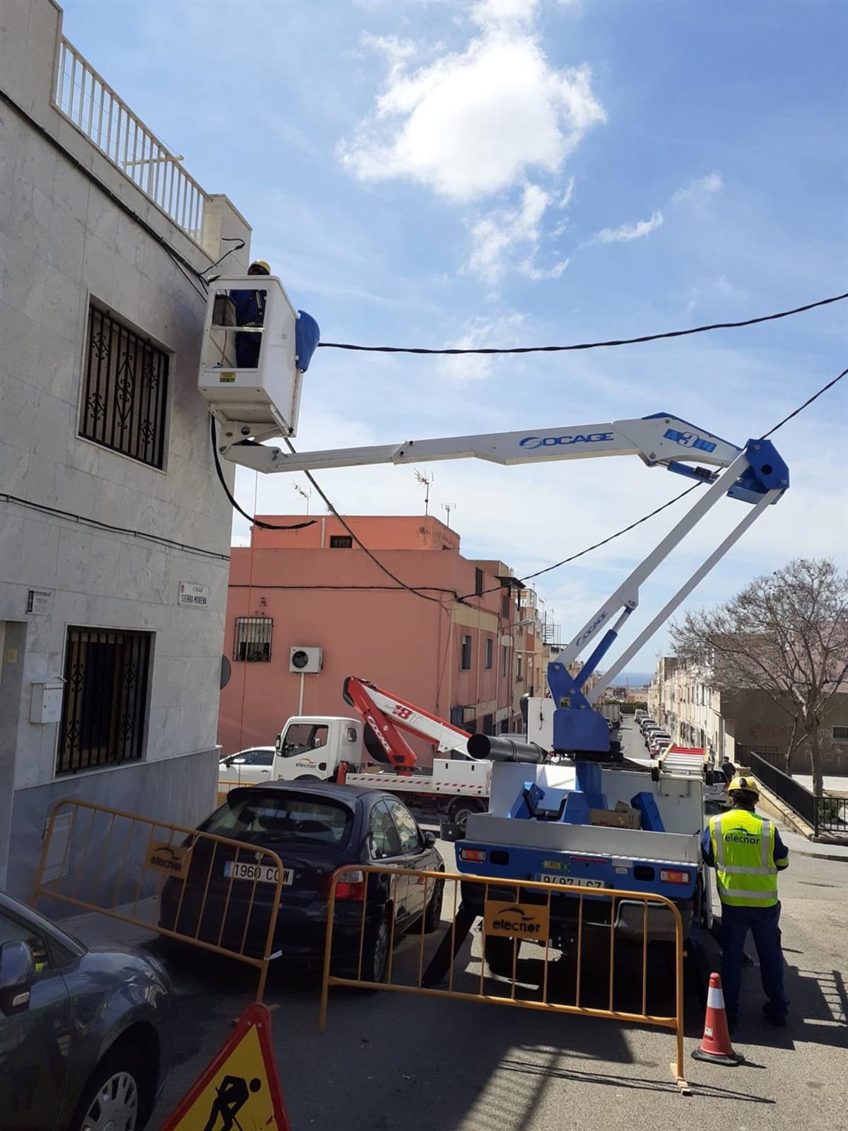 Endesa sigue trabajando en los barrios de Almería más afectados por las sobrecargas en las redes de distribución que provocan los enganches ilegales, agravados por el estado de alarma, y ha conectado este jueves al centro de distribución ubicado Los Almendros unos 1.000 metros de nuevo cableado subterráneo de Baja Tensión, y tendido otros 350 metros de línea aérea de Baja Tensión gracias a tres apoyos de hormigón que se han instalado con una grúa especial.
