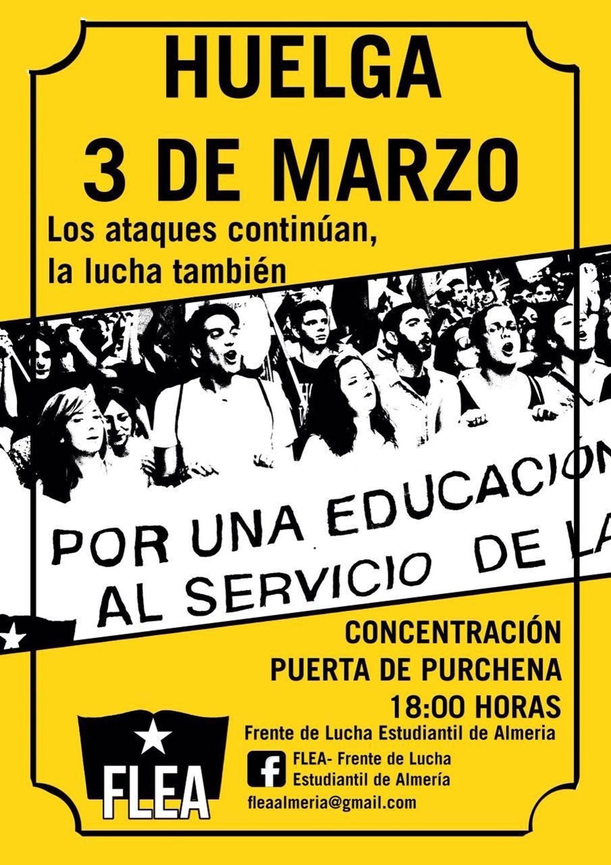El Frente de Lucha Estudiantil de Almería (FLEA) han convocado para el próximo 3 de marzo una concentración ante la "insostenible situación" para los estudiantes por la "sucesión de ataques a la educación pública, los extremos recortes presupuestarios de las diversas administraciones a las partidas de educación, así como la privatización, mercantilización y elitización de la universidad".