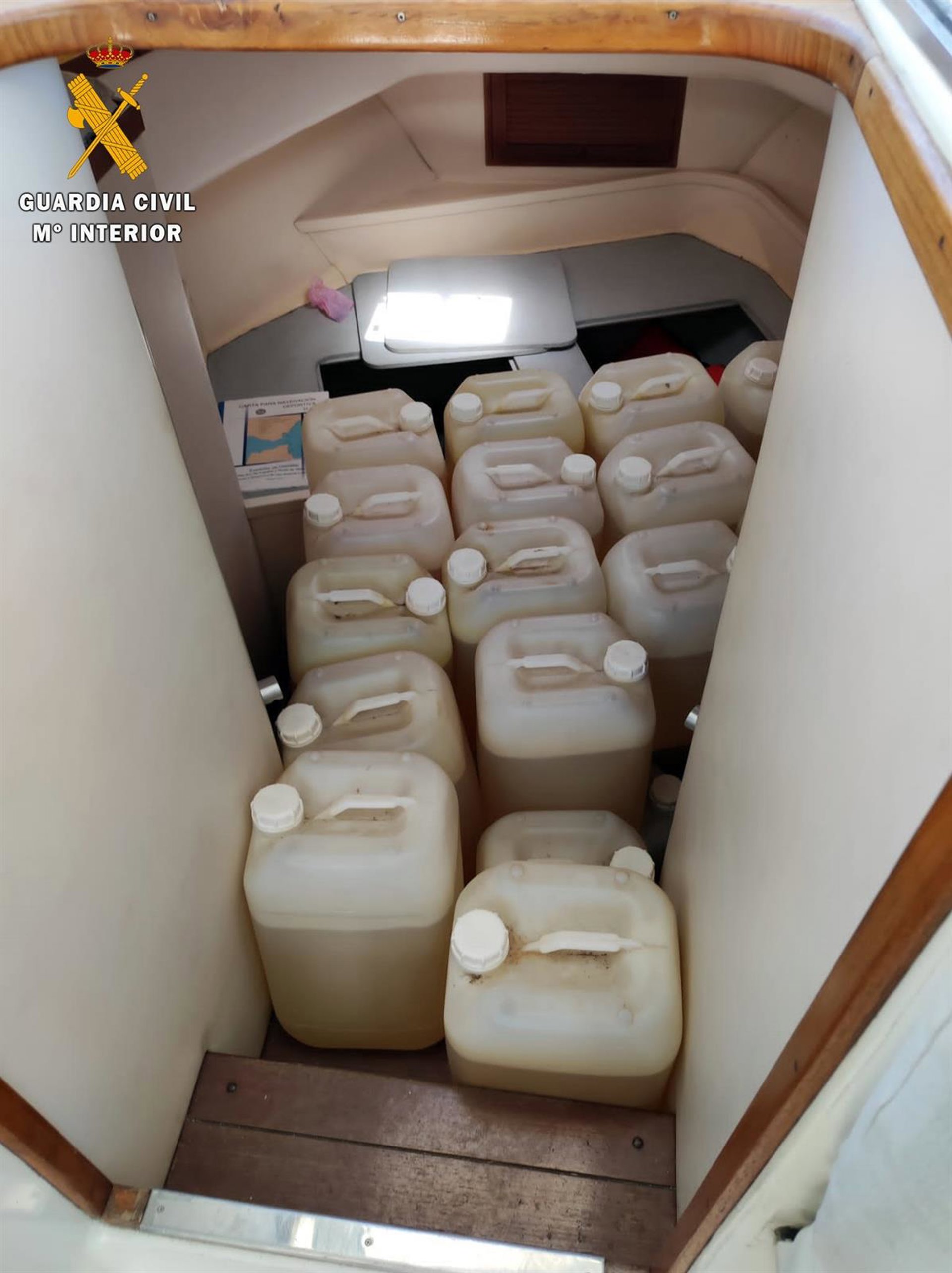 En la primera actuación, el personal de la Guardia Civil durante sus patrullas de inspección en puertos recreativos identifica una embarcación atracada en el Puerto Deportivo de Aguadulce-Roquetas de Mar (Almería) y localiza 130 garrafas de combustible de 25 litros cada una (3.250 litros) por lo que se propone para sanción ante la Administración de Aduanas e Impuestos Especiales por una infracción de contrabando.