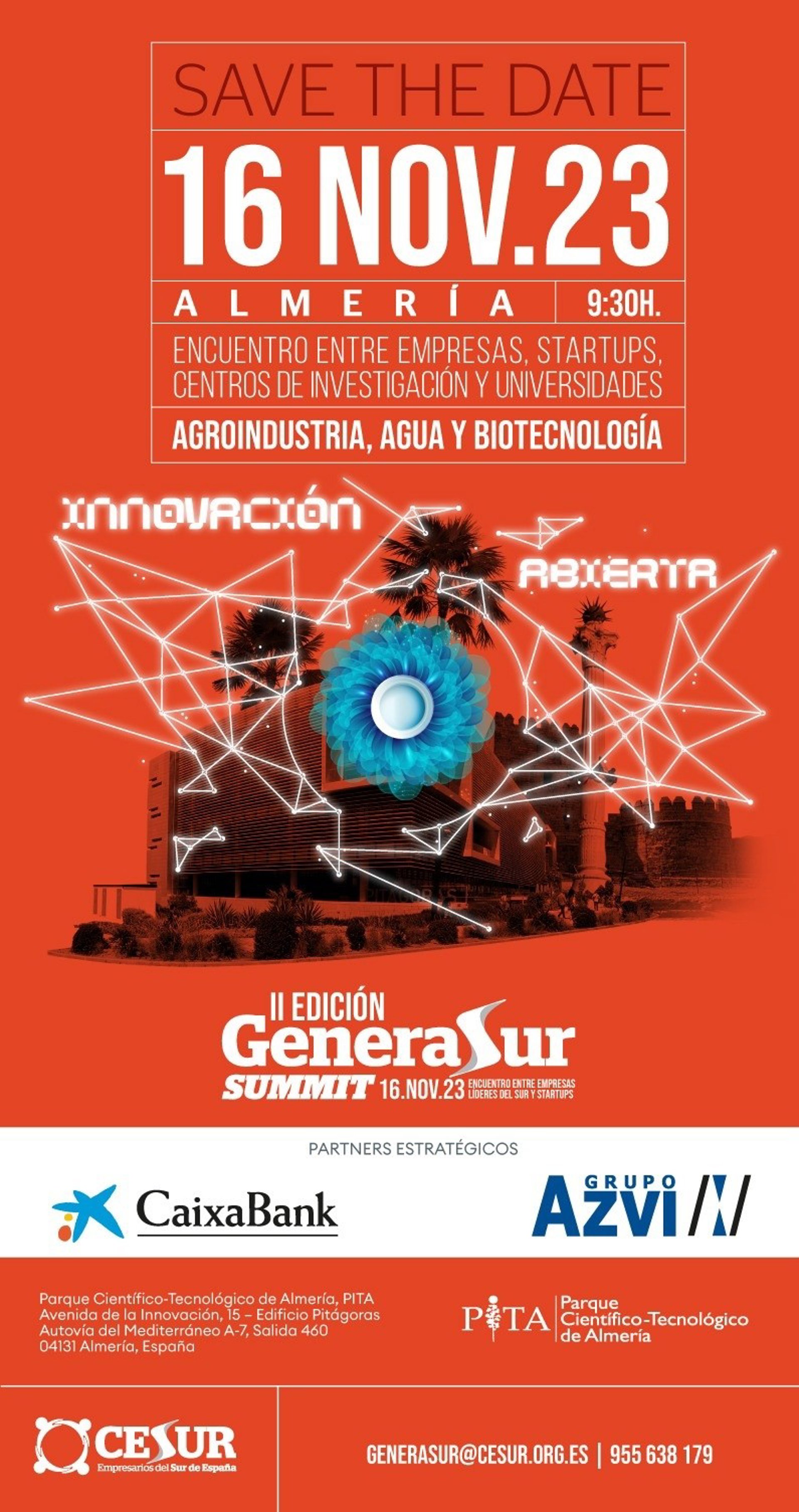 La asociación de Empresarios del Sur de España (Cesur) presenta el próximo día 16 en el Parque Científico-Tecnológico de Almería PITA el II Summit de GeneraSur, su centro de innovación y desarrollo empresarial.