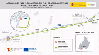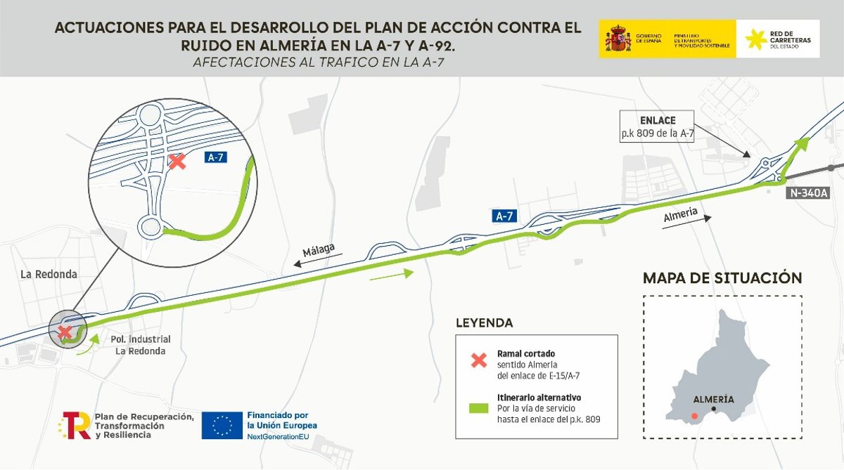 El Ministerio de Transportes y Movilidad Sostenible ha informado del corte durante dos meses del ramal de incorporación a la A-7 sentido Almería desde el enlace 814, a su paso por el polígono industrial La Redonda de El Ejido (Almería), a partir del próximo lunes con motivo de la instalación de sistemas antirruido en la citada vía.