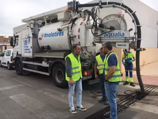 La limpieza de las rejillas de los imbornales se realiza manualmente con vehículos de limpieza industrial. Los trabajadores de Aqualia recogen los residuos extraídos y los llevan a un vertedero. Finalmente, insertan agua a presión en el imbornal para asegurarse de que el atasco ha desaparecido.