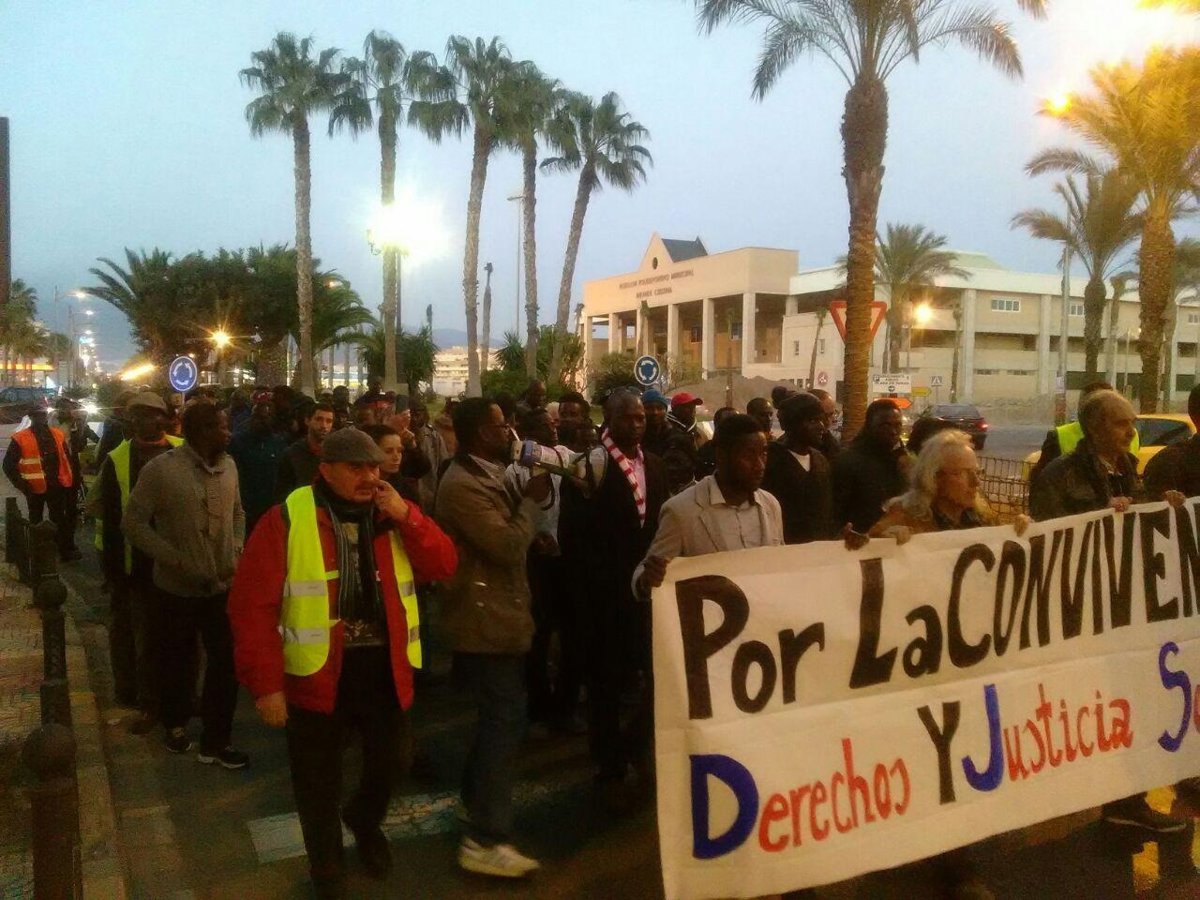 "Más de 200 personas", según los organizadores, se han manifestado este sábado por la tarde en Roquetas de Mar (Almería) bajo el lema 'Por la convivencia: derechos y justicia social', convocadas por la Federación de Asociaciones y Amigos de Cacheu de Guinea Bissau y en colaboración con la Plataforma por los Derechos y la Justicia Social.