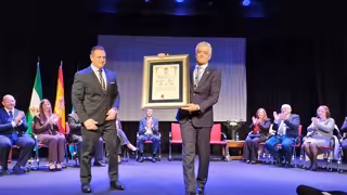 El director y presentador del programa de reporterismo de Canal Sur Televisión 'Andalucía Directo', Modesto Barragán, recoge el reconocimiento de Hijo Adoptivo de Macael. - RTVA