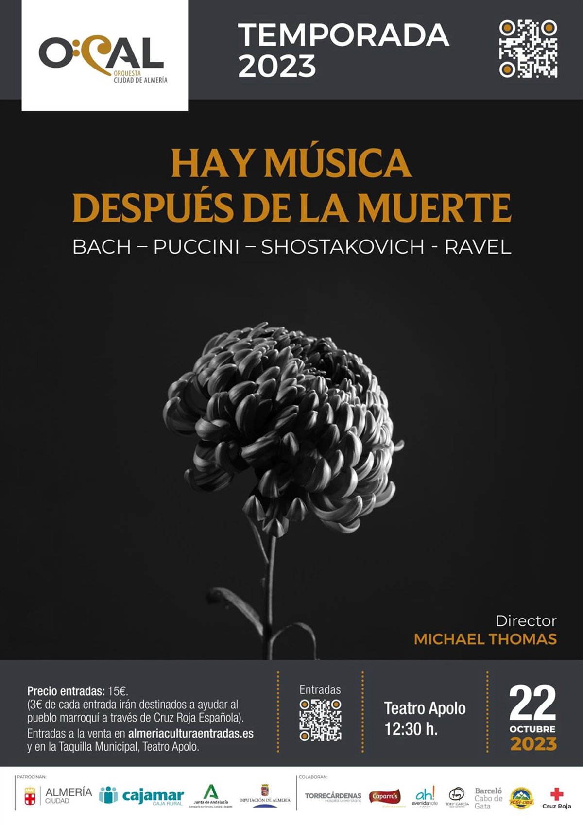 La Orquesta Ciudad de Almería (OCAL) va a ofrecer el próximo domingo en el Teatro Apolo de la capital un concierto bajo el título 'Hay música después de la muerte' con el que parte del dinero de las entradas se destinará a Cruz Roja Española a fin de destinar los fondos a los afectados por el terremoto de Marruecos.