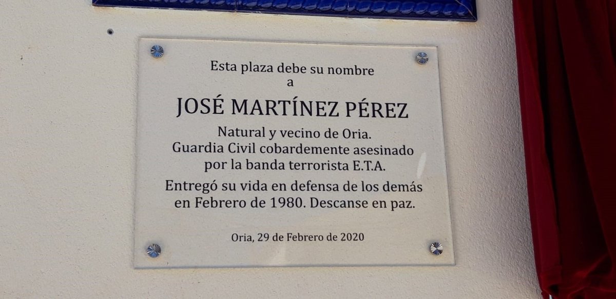 En el acto ha estado Blas Martínez, hermano del homenajeado, quien en compañía del alcalde, Marcos Reche, ha descubierto la placa que da nombre a la plaza junto a la vivienda familiar en reconocimiento de la ciudadanía de Oria a su ilustre vecino. En ella se lee 'Esta plaza debe su nombre a José Martínez Pérez, natural y vecino de Oria, guardia civil cobardemente asesinado por la banda terrorista ETA. Entregó su vida en defensa de los demás en febrero de 1980. Descanse en paz. Oria, 29 de febrero de 2020'.
