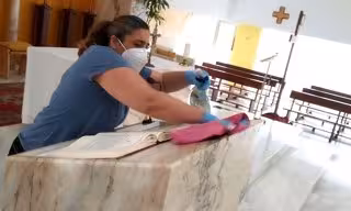 "Estamos utilizando productos higienizantes y desinfectantes aprobados por la Unión Europea, que se aplican a los micrófonos, bancos, pomos o apliques de la luz para que todos los feligreses, cuando puedan venir a misa, puedan hacerlo con la tranquilidad que su parroquia está libre de coronavirus" ha explicado el responsable de la empresa de limpieza 'La Central', Francisco Moya, quien participa en la limpieza de los centros de culto.