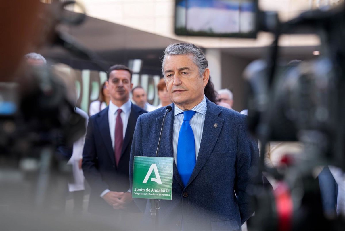 El consejero de Sanidad, Presidencia y Emergencias de la Junta de Andalucía, Antonio Sanz, interviene dentro del acto inaugural de las nuevas Consultas Externas del Hospital Universitario Torrecárdenas de Almería. A 17 de noviembre de 2025. - Marian León - Europa Press