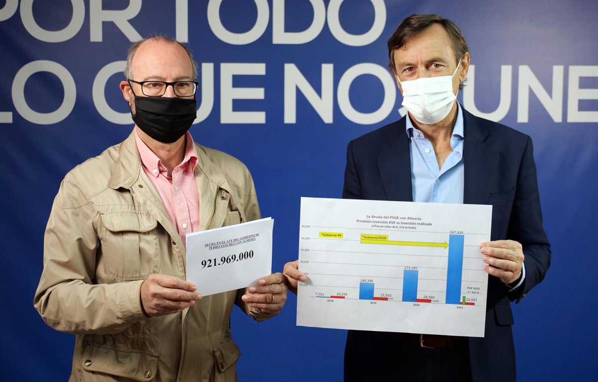 Los senadores del PP de Almería Rafael Hernando y Luis Rogelio Rodríguez han criticado este sábado que la "deuda" del Gobierno de Pedro Sánchez con el AVE Almería-Murcia es de "más de 900 millones de euros" y han mostrado respuestas parlamentarias del propio Gobierno con el objetivo de "desmentir" las declaraciones del subdelegado del Gobierno, Manuel de la Fuente, "quien a finales de agosto aseguraba que su gobierno había invertido en el AVE en la provincia más de 1.000 millones de euros".