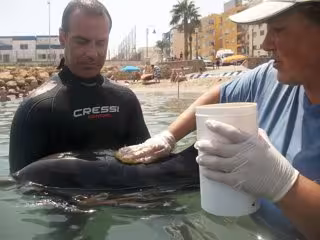El cetáceo, al que se ha llamado 'Marcos' en honor a uno de los primeros bañistas que se dio cuenta de su presencia, está siendo sometido a un tratamiento veterinario y, a la espera de comprobar como evoluciona, "come con facilidad y mantiene un número de respiraciones normales".
