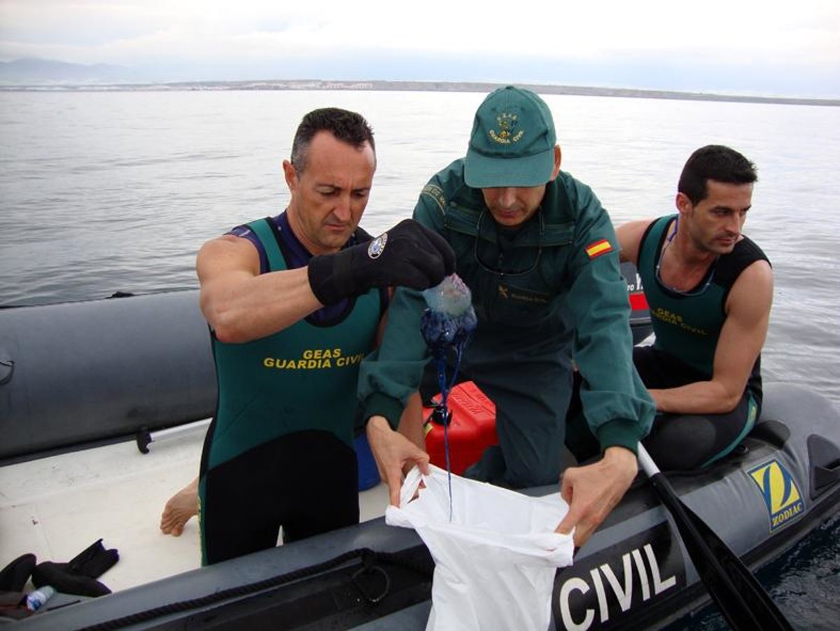 Efectivos del Grupo Especial de Actividades Subacuáticas de la Guardia Civil han retirado al menos 40 ejemplares de medusa de la especie 'Carabela Portuguesa' en aguas frente al litoral de Punta Entinas-Sabinal, entre los municipios de Roquetas de Mar y El Ejido (Almería).