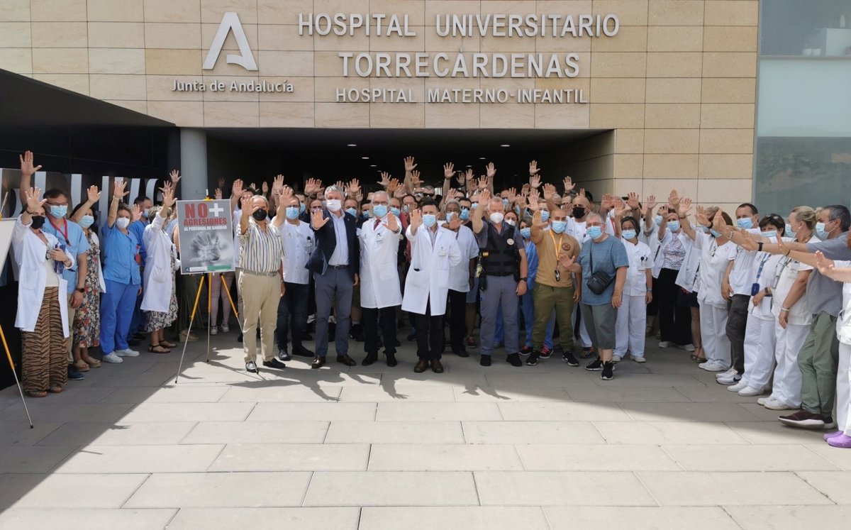 Personal de los centros sanitarios de Almería se han concentrado este martes para expresar su "más enérgica repulsa" por la agresión a dos trabajadores del servicio de seguridad del Hospital Universitario Torrecárdenas de la capital por parte de, al menos, cuatro personas que permanecen detenidas en dependencias policiales y para trasladar "todo el apoyo del sistema" a las víctimas.