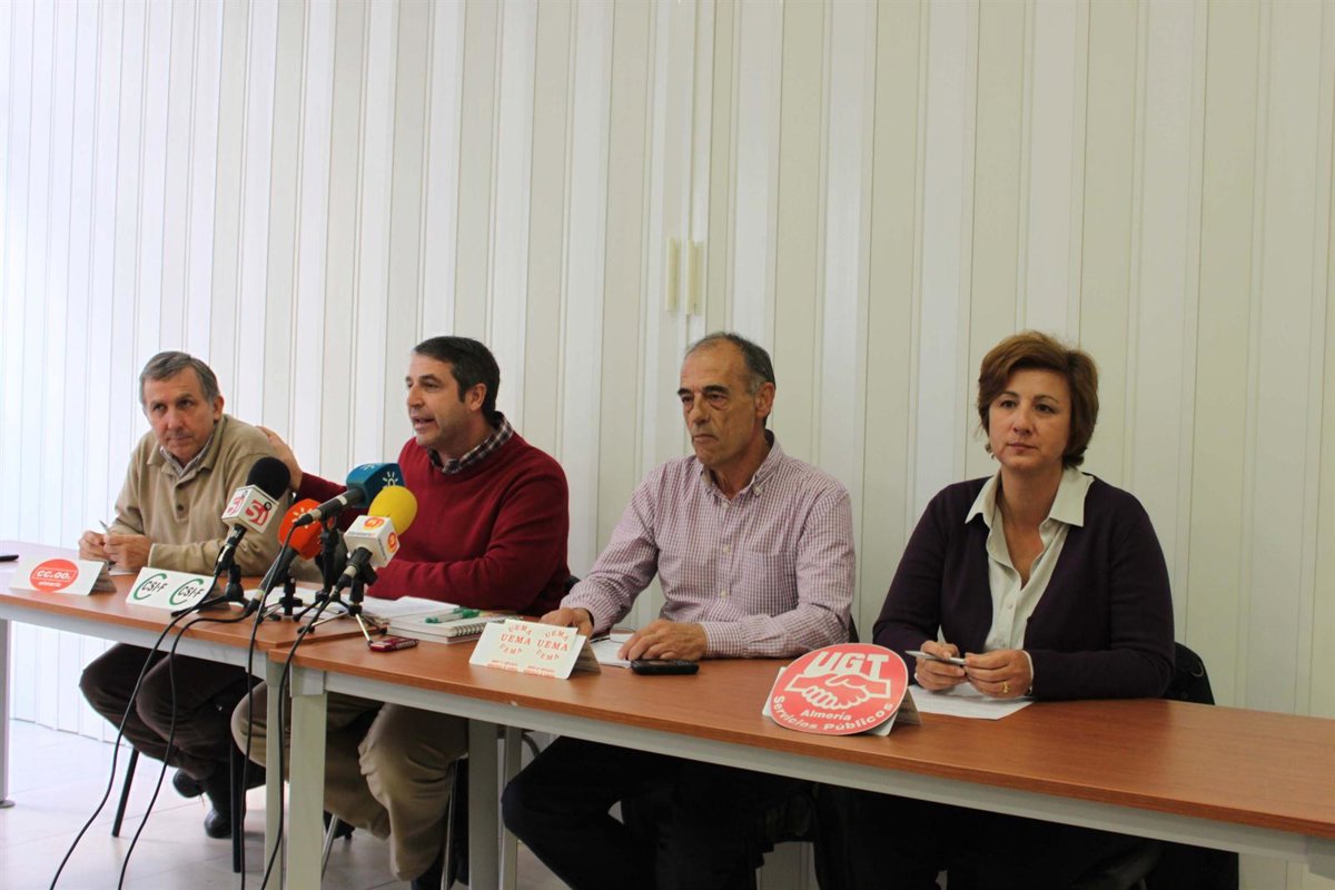 Los sindicatos UGT, CCOO, CSIF y UEMA han anunciado este martes el calendario indefinido de movilizaciones que van a iniciar como medida de protesta ante la "ruptura" de las negociaciones con el equipo de gobierno del Ayuntamiento de Almería (PP) sobre el próximo convenio colectivo, de manera que, según han explicado, "se hará un seguimiento sindical de acompañamiento a las autoridades municipales en sus actos públicos, sin que en ningún momento se altere el tráfico ni la libre circulación de personas".