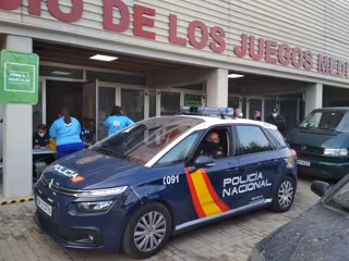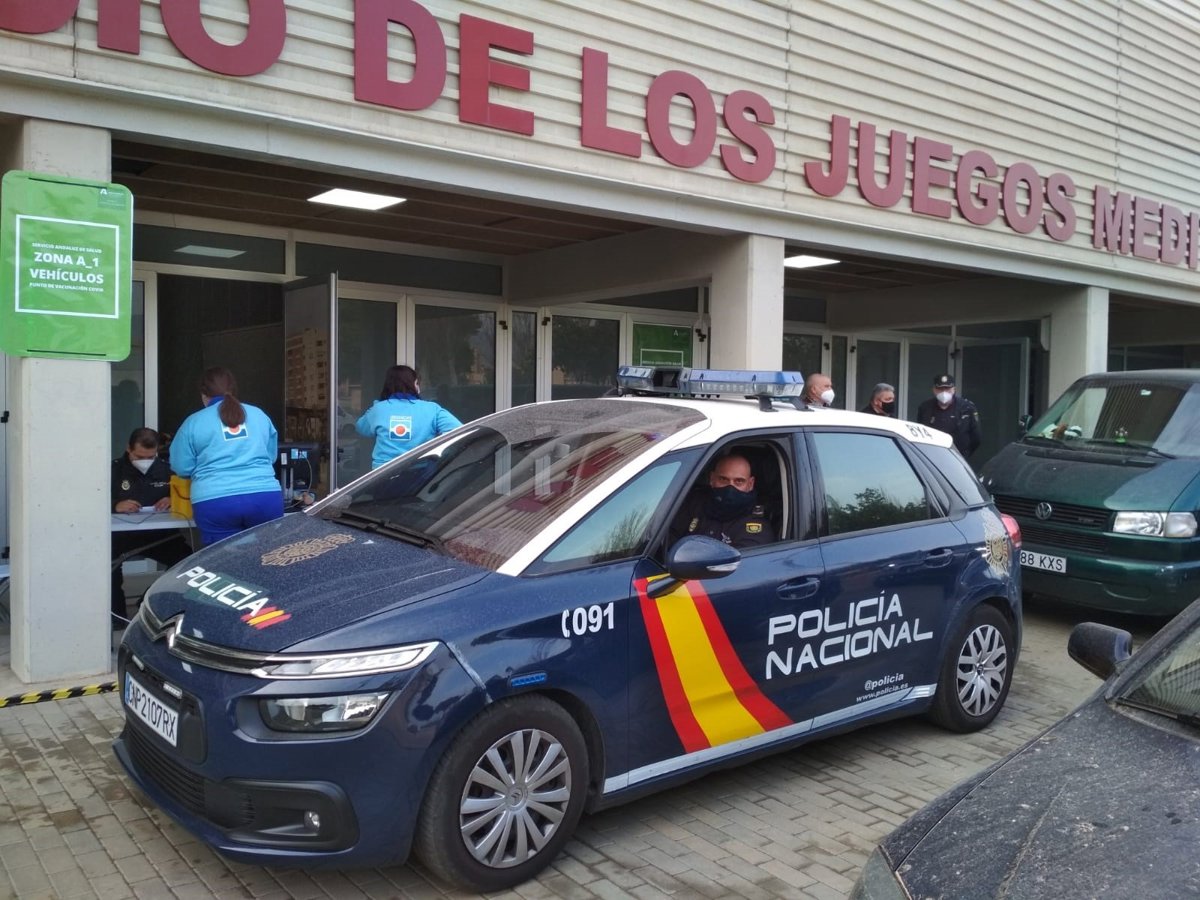 Coche patrulla en el centro de vacunación masiva del Palacio de los Juegos Mediterráneos - POLICÍA NACIONAL