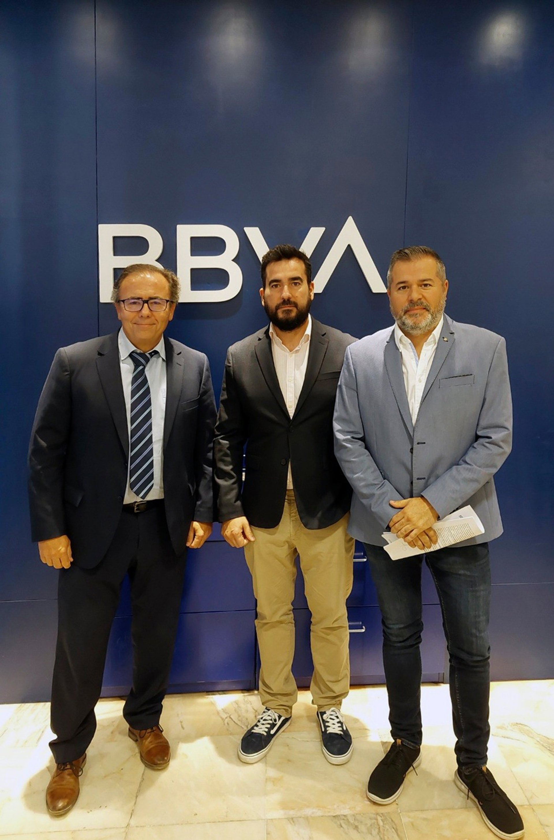 (Desde Izda) El Director De Banca De Clientes De BBVA, Joaquín Rodríguez; El Director De Desarrollo De Negocio De Enchufesolar, Antonio Gómez, Y El CEO De La Compañía, Daniel Montilla, Tras La Firma Del Acuerdo. - ENCHUFESOLAR