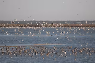 Archivo - Bando de agujas colinegras y gaviotas en las marismas del Odiel de Huelva. - SEO/BIRDLIFE/JOSÉ MANUEL MÉNDEZ - Archivo