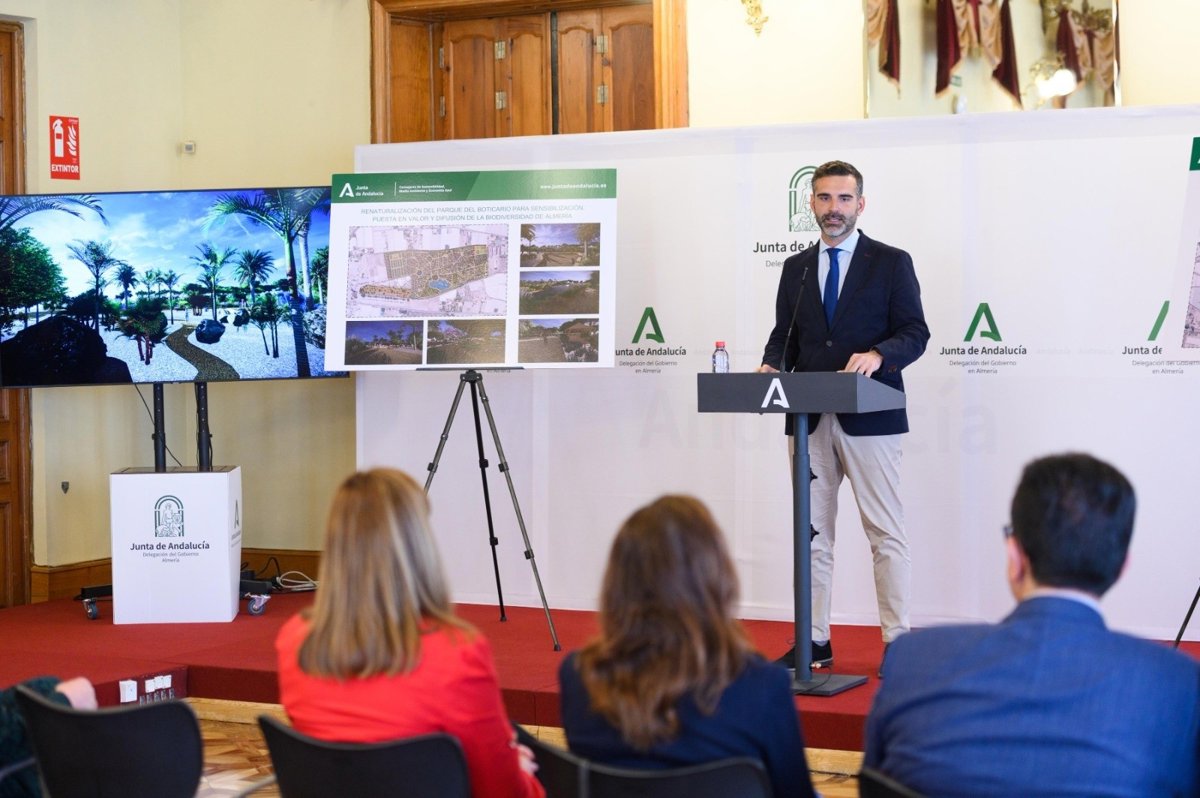 El consejero de Sostenibilidad, Medio Ambiente y Economía Azul, Ramón Fernández- Pacheco, ha presentado este viernes el proyecto de recuperación del Parque de El Boticario de Almería, que cuenta con un presupuesto base de licitación superior a los tres millones de euros.