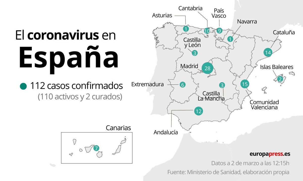 En España ya hay 112 casos confirmados de coronavirus, 110 activos y 2 curados