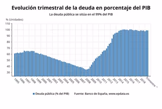 Evolución trimestral de la deuda pública en porcentaje del PIB hasta el segundo trimestre de 2019 (Banco de España) - EPDATA