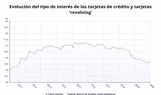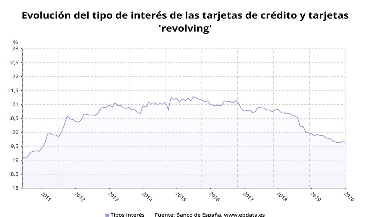 Evolución del tipo de interés de los créditos de las tarjetas de crédito y 'revolving' (Banco de España) - EPDATA