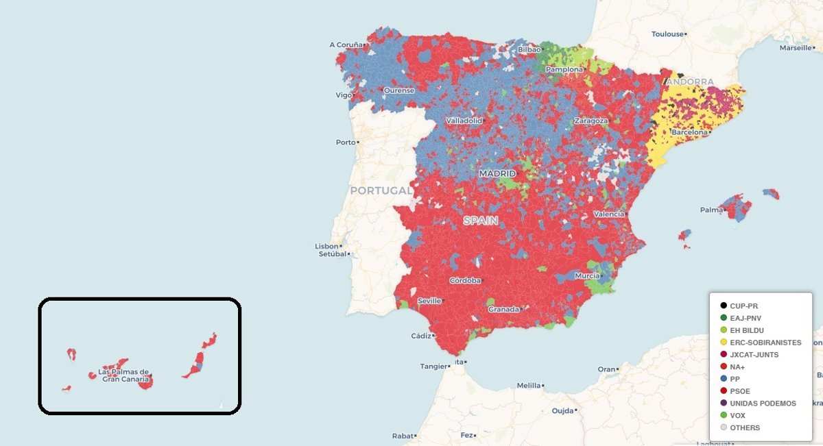 Mapa del resultado de las elecciones del 10-N, municipio a municipio